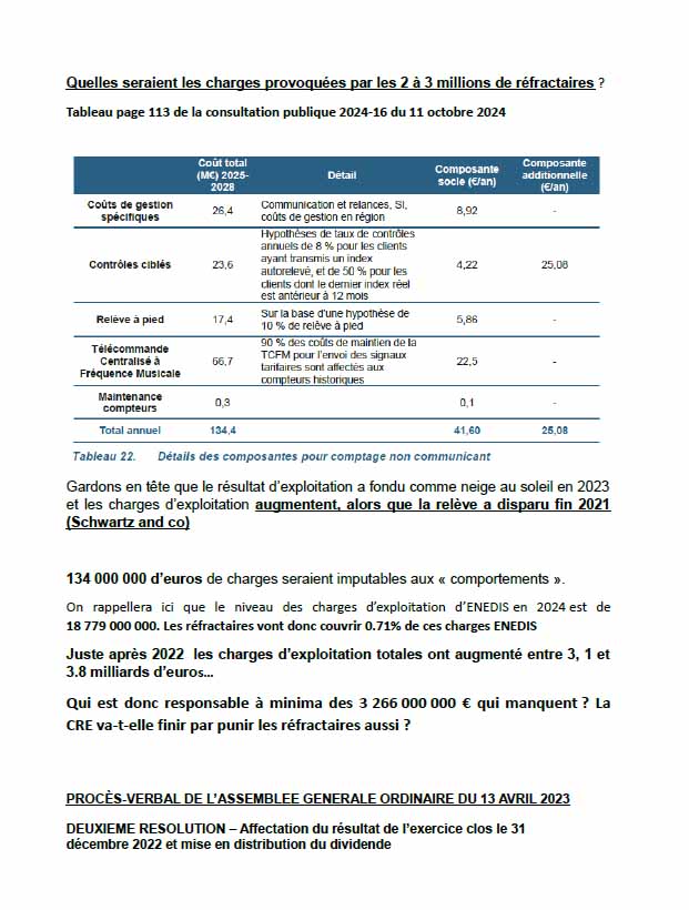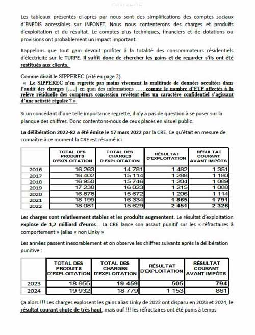 Or, les bénéfices d’Enedis ont été d’environ 5 milliards entre 2017 et 2023. Et la CRE, dans sa consultation publique n° 2024-26, justifie les 134,4 millions que devraient payer les clients non-Linky de la façon suivante : 23,6 millions correspondent au coût des contrôles ciblés (pour 160 000 clients, ce qui donne environ 140 € par contrôle, un coût très surestimé), 17,4 millions sont destinés à la relève à pied ( ! ) sur la base de 10 % de relève à pied (re-!), auxquels il faut ajouter 66,7 millions au titre du simple maintien de la « télécommande centralisée à fréquence musicale ».